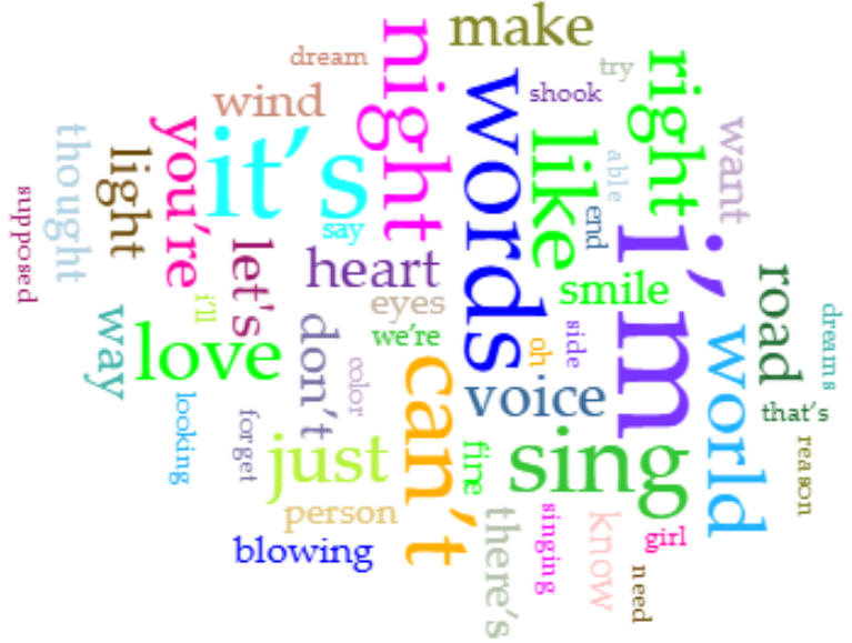 This is the word cloud for HOWLS. The most commonly occurring words are; i’m (30); it’s (27); words (19); sing (18); night (18). Once again, this is the 50 word cloud, with stopwords automatically filtered out. Some instances of I'm are "I'm not the one you're looking at though, huh?" (from "Sleepwalk"), "I'm sick and tired of hearing about methodologies or right and valid theories" (from "Coyote and Ghost"), and "Unknowing yet I'm still smiling unfazed" (from "Windmill").