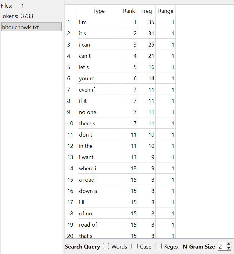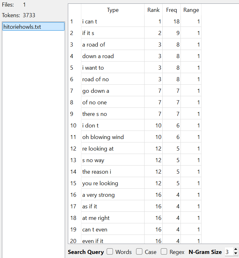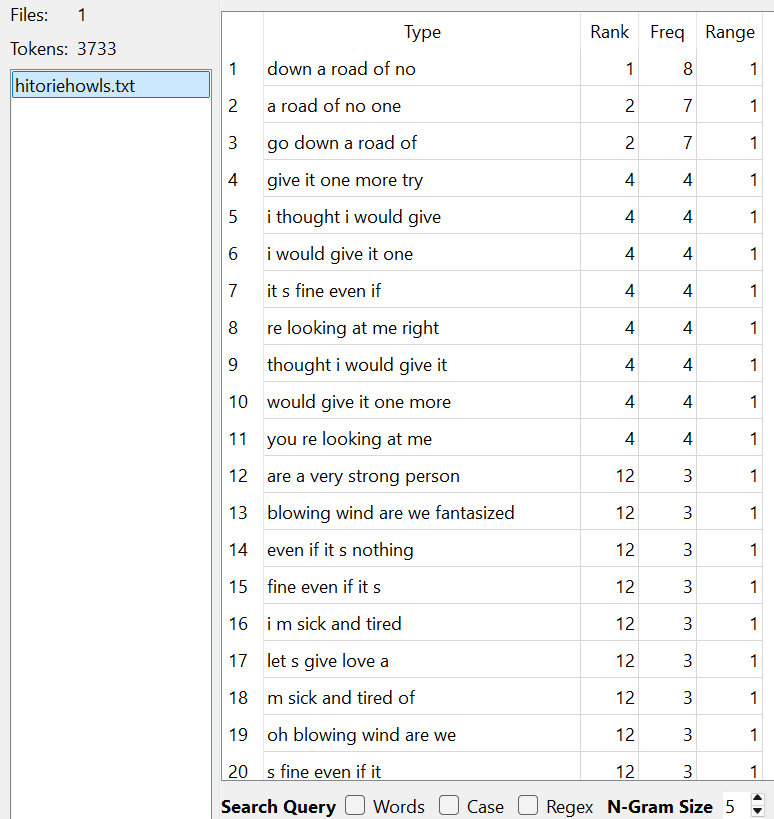 These are the 2, 3, and 5 ngram result for the HOWLS album respectively. The most common for the 2 ngram were "i m" with 35 hits, followed by "it s" at 31 and "i can" at 25. The 3 ngram had "i can t" at 18, "if it s" at 9, and a four way tie between "a road of", "down a road", "i want to", and "road of no", all with * occurrences (three of which coming from the same sentences). The 5 ngram has "down a road of no" at first with 8, a two way tie for second with "down a road of no" and "give it one more try" at 7, and an eight way tie for third. In total, HOWLS has 3733 tokens to analyze.