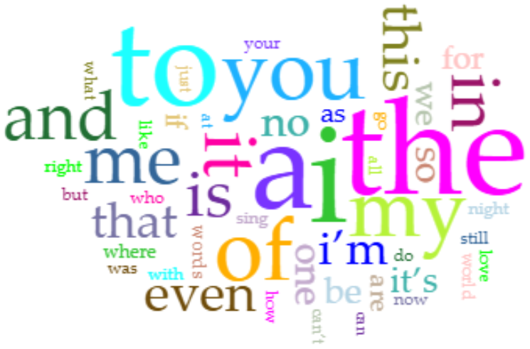This, just like above, is the 50 word cloud with the stopwords on. The most common occurrences for this one are; i (146); the (110); to (101); a (92); of (63). Once again, I was the most common result, though lower than the Unhappy Refrain album. Though, given the differences in the sizes, I'm curious if it'd roughly the same amount.