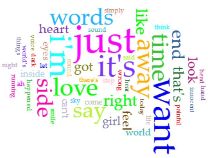This is the word cloud for Unhappy Refrain. You can see the most common words used within the album are; just (36); want (26); it's (26); i'm (23); time (18).This is the 50 word cloud with stopwords automatically filtered out. I found it interesting that of all words, just was the most common. Some instances of it's use in the text are "Doesn't it hurt just to look at?" (from the lyrics of the song "Unhappy Refrain"), "I just wanted to say I love you" (from "Reversible Doll), and "please, just leave me alone" (from "Toosenbo"). The second most common word is want, tied with it's.
