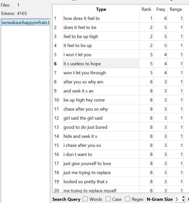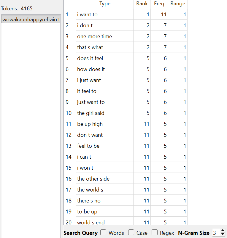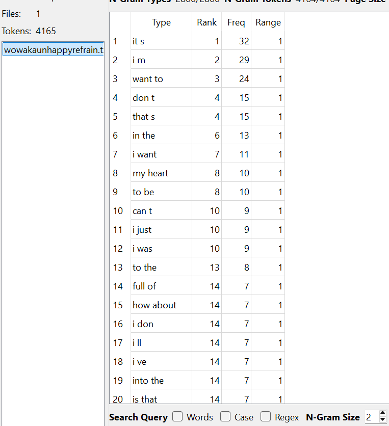 These are the 2, 3, and 5 ngram result for the Unhappy Refrain album respectively. The most common for the 2 ngram were "it s" with 32 hits, followed by "i m" at 29 and "want to" at 24. The 3 ngram had "i want to" at 11 and a three way tie for second between "i don t", "one more time", and "that s what" with 7 occurrences. The 5 ngram has "how does it feel to" at first with 6, and another three way tie between "does it feel to be", "feel to be up high", and "it feel to be up" with 5 occurrences (which are from the same sentence that occurs 5 times). In total, Unhappy Refrain has 4165 tokens to analyze.