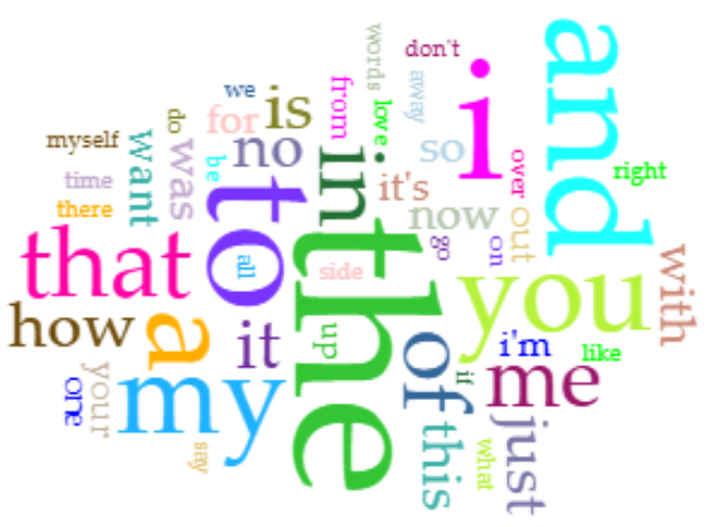 This second image is the is the 50 word cloud with stopwords on, which I find equally interesting. The word occurrences are as follows; i (169); the (166); to (119); and (87); a (73). I showing up so often was interesting to me.